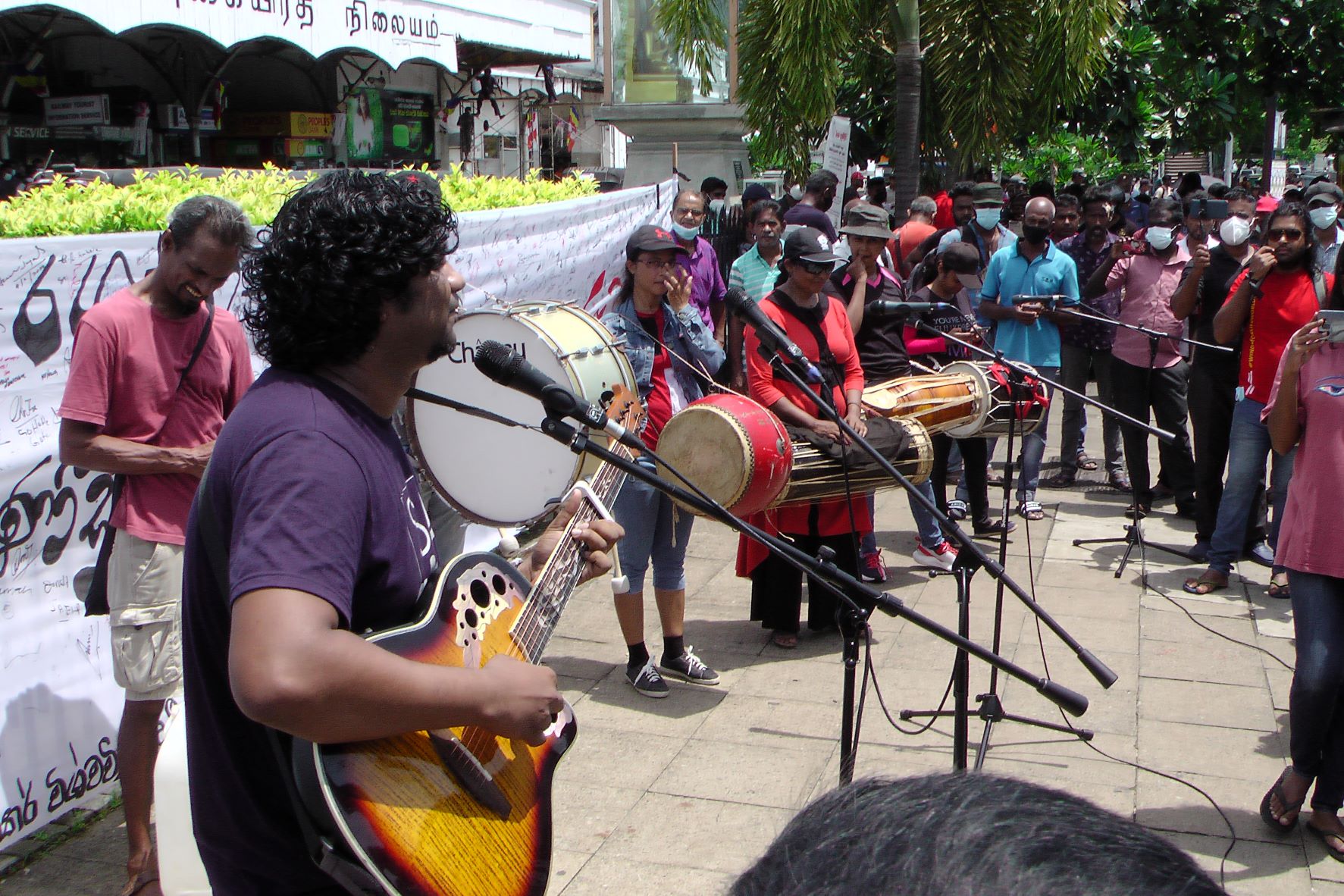 இதன்போது அரசுக்கு எதிராக சில பாடல்களை இசைத்து தமது எதிர்ப்பை வெளிப்படுத்தியதுடன் அனைத்து பல்கலைக்கழக மாணவர்கள் ஒன்றியத்தினால் பொய்களை தவிர்ப்போம் போராட்டத்தை வெற்றியடைவோம் எனும் தலைப்பில் பிரசுரிக்கப்பட்ட துண்டுப்பிரசுரங்களும் மக்களுக்கு வழங்கப்பட்டது.