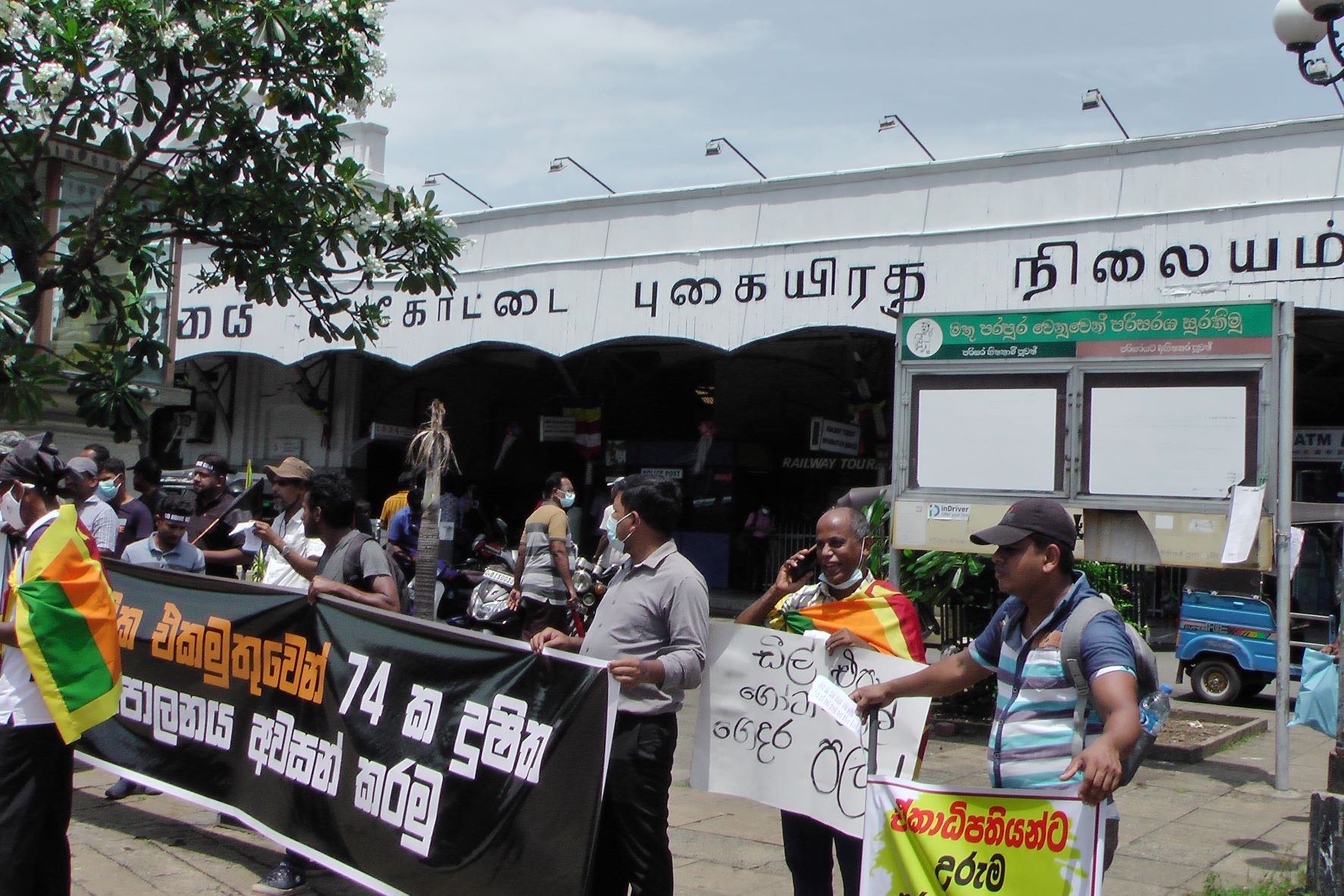 ஜனாதிபதியையும் அரசாங்கத்தையும் பதவி விலகுமாறு கோரி இன்று நண்பகல் ரஜரட்ட பல்கலைக்கழக மாணவர்கள் கொழும்பு கோட்டை புகையிர நிலையத்திற்கு முன்பாக எதிர்ப்பு ஆர்ப்பாட்டம் ஒன்றை மேற்கொண்டிருந்தனர்.
