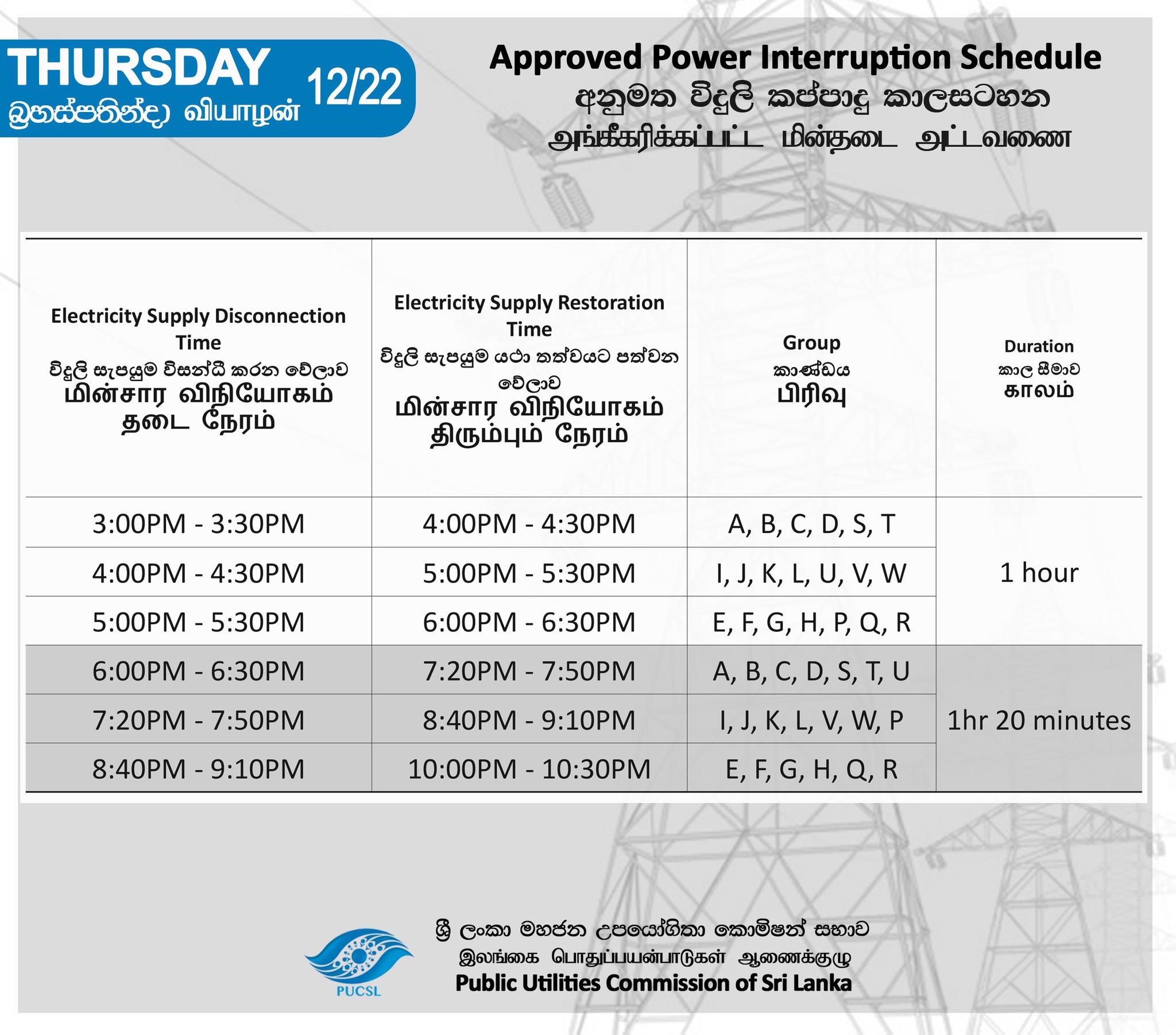 அதன்படி, A, B, C, D, E, F, G, H, I, J, K, L, P, Q, R, S, T, U, V மற்றும் W ஆகிய 20 வலயப் பகுதிகளில் பி.ப 3 மணி முதல் மாலை 6 மணி வரையிலான நேர இடைவெளியில் 1 மணிநேரமும், மாலை 6 மணி முதல் இரவு 10 மணி வரையிலான நேர இடைவெளியில் 1 மணிநேரம் 20 நிமிடங்களும் என 2 மணித்தியாலங்கள் 20 நிமிடங்கள் மின் வெட்டு அமுல்ப்படுத்தப்படும்.