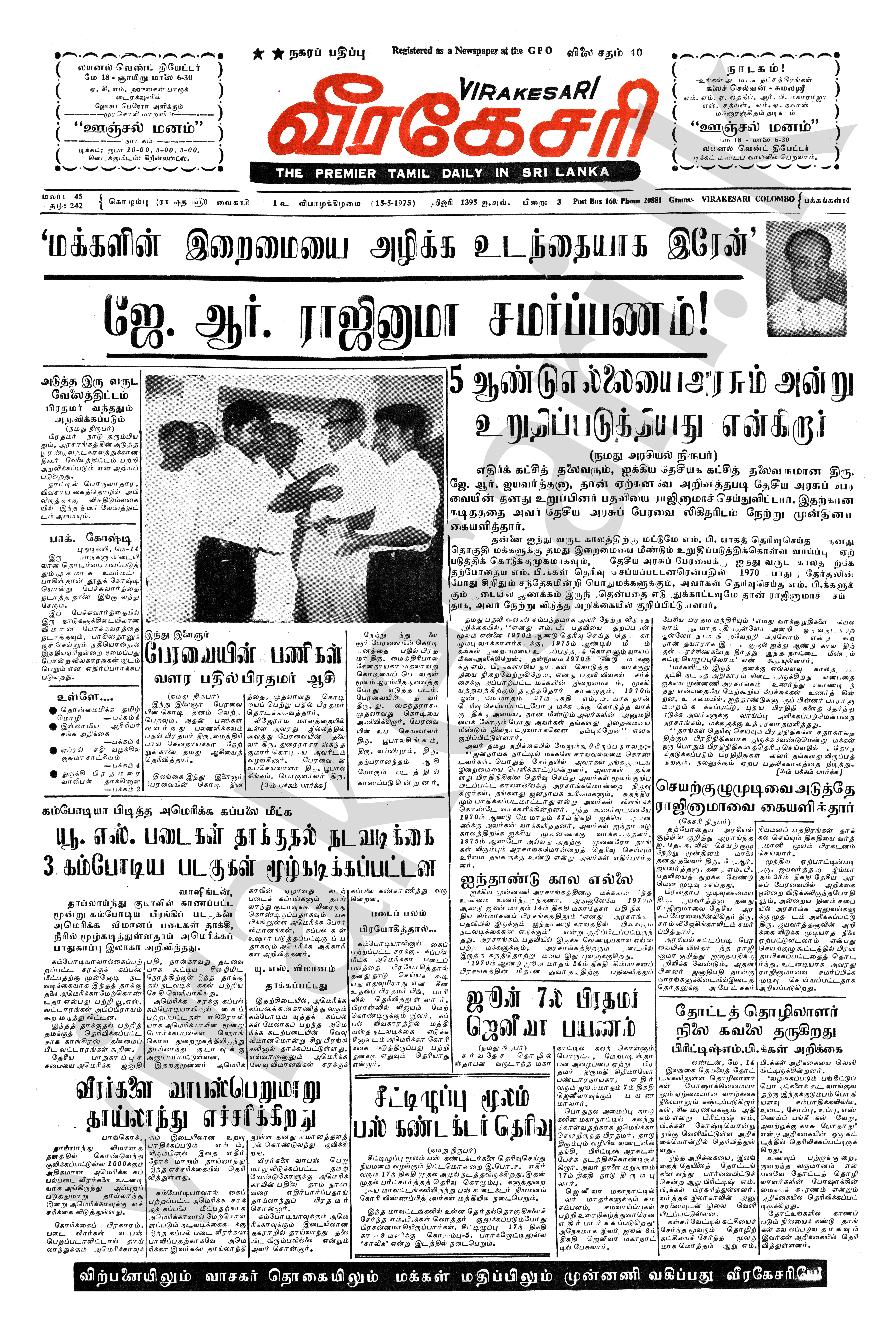 ஜே.ஆர். தனது இராஜினாமா கடிதத்தை தேசிய அரசுப் பேரவைக்கு சமர்ப்பித்தமை தொடர்பான செய்தியை, 1975 மே 15ஆம் திகதியான இதைப் போன்ற நாளில் வெளியான வீரகேசரியில் "மக்களின் இறைமையை அழிக்க உடந்தையாக இரேன் : ஜே.ஆர். ராஜினாமா சமர்ப்பணம்" என்ற தலையங்கத்துடன் முதல் பக்கத்தில் காணலாம்.