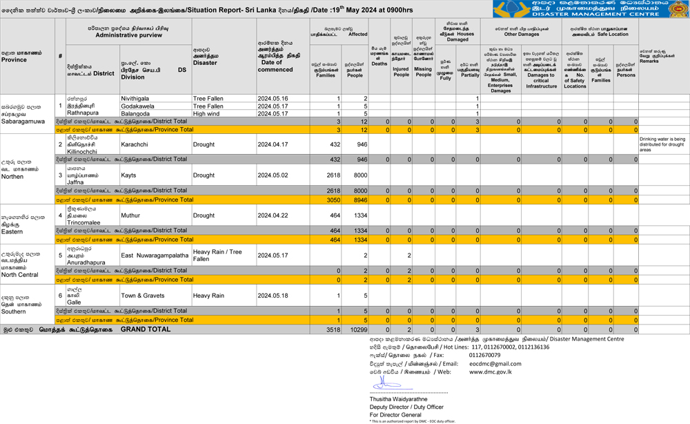 இதேவேளை, யாழ்ப்பாணத்தில் 8,000 பேரும், திருகோணமலையில் 1,334 பேரும், கிளிநொச்சியில் 946 பேரும் வரட்சியினால் பாதிக்கப்பட்டுள்ளது.