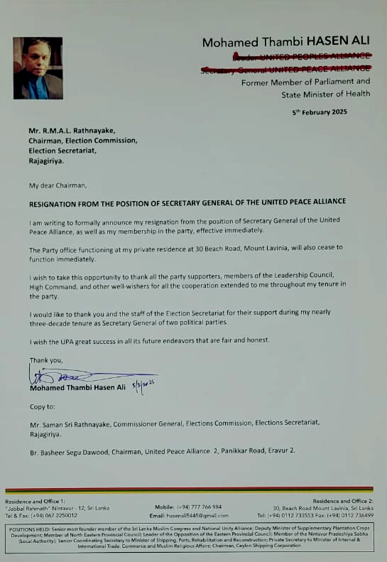 ஐக்கிய சமாதானக் கூட்டமைப்பின் பொதுச் செயலாளர் பதவியில் இருந்தும், கட்சியில் எனது உறுப்பினர் பதவியிலிருந்தும் இராஜினாமா செய்வதை, உடனடியாக அமுலுக்கு வருவதை முறையாக அறிவிக்கின்றேன்.
