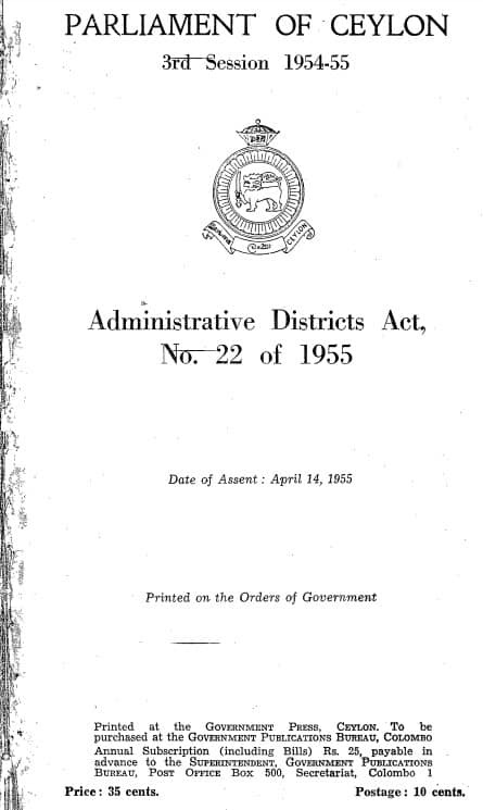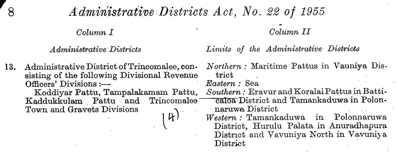 ஆரம்பத்தில் தமிழ் பேசும் மக்களை பெரும்பான்மையாக கொண்டிருந்ததன் காரணமாக 1955ஆம் ஆண்டின் நிர்வாக மாவட்ட சட்டம் 22இன் அடிப்படையில் கொட்டியார் பற்று, தம்பலகாமம் பற்று, கட்டுக்குளம் பற்று, திருகோணமலை பட்டிணமும் சூழலும் ஆகிய நான்கு நிர்வாக அலகுகளாக பிரிக்கப்பட்டிருந்தது.