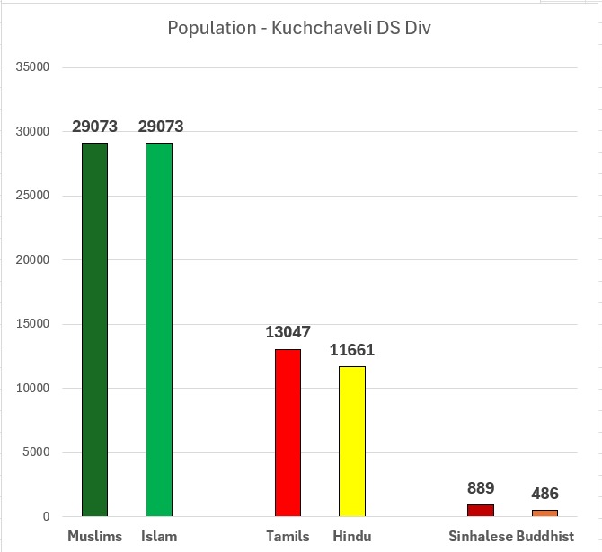 அத்துடன் இங்கு 13,679 குடும்பங்களைச் சேர்ந்த 43,009 பேர் வாழ்ந்து வருகின்றனர். இவர்களில் 21,599 ஆண்களும் 21,410 பெண்களும் அடங்குகின்றனர். குறிப்பாக, 29,073 முஸ்லிம்களும் 13,047 தமிழர்களும் 889 சிங்கள மக்களும் வாழ்ந்து வருகின்றபோதிலும் 889 சிங்கள மக்களில் 486 பேர் மாத்திரம் பௌத்த மதத்தை தழுவுபவர்களாக இருக்கின்றார்கள். ஆனால், குச்சவெளியில் 30க்கு மேற்பட்ட விகாரைகள் பதிவு செய்யப்பட்டு இதற்காக தமிழ் பேசும் மக்களுடைய பெருமளவான காணிகள் ஆக்கிரமிக்கப்பட்டு வருகின்றன.