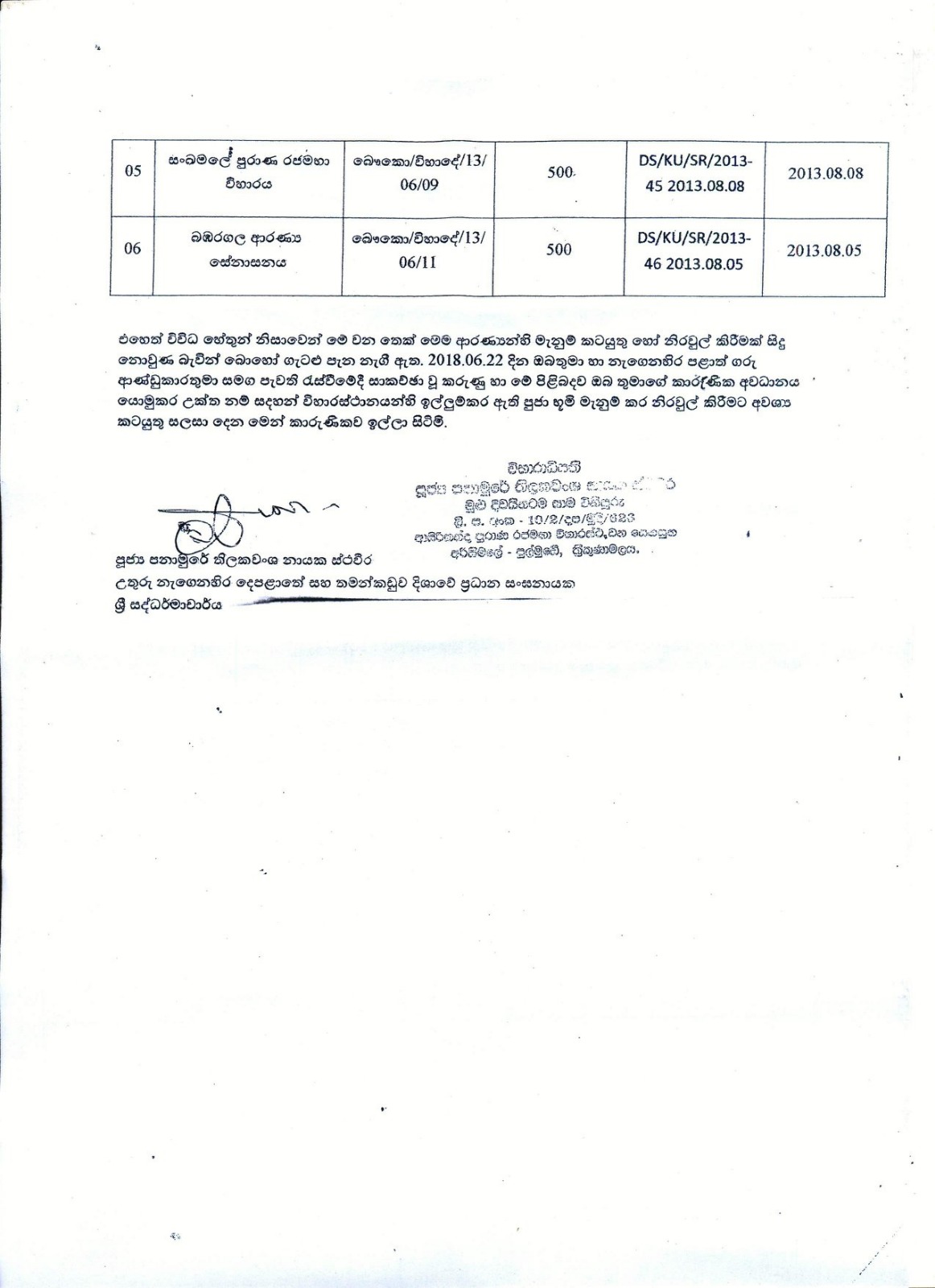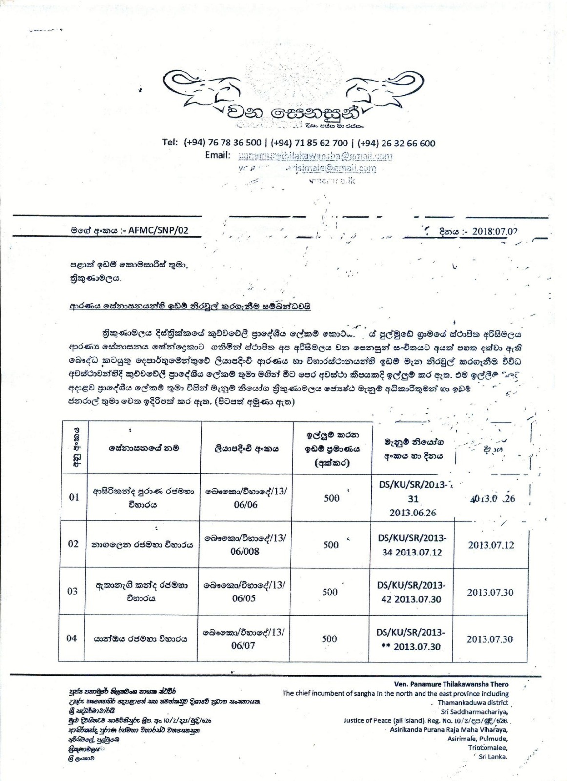இதை விட அரிசிமலை விகாரையின் விகாராதிபதி பானாமூரே திலகவங்ச நாயக்க தேரரினால் 2018.07.02 திகதியிடப்பட்டு 6 விகாரைகளுக்காக 500 ஏக்கர் காணி வழங்குமாறு அப்போதைய ஜனாதிபதிக்கு கடிதம் அனுப்பி வைக்கப்பட்டிருந்தது.