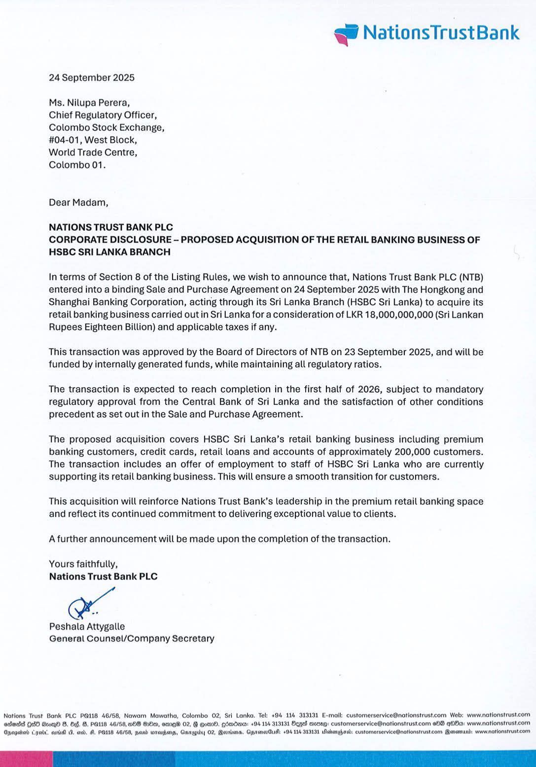 இலங்கையில் இயங்கி வரும் சர்வதேச வங்கியான ஹெச்எஸ்பிசி (HSBC) வங்கியின் சில்லறை வர்த்தக வணிகப் பிரிவை (Retail Banking Business) நேஷன்ஸ் ட்ரஸ்ட் வங்கி (Nations Trust Bank PLC) 18 பில்லியன் இலங்கை ரூபாவுக்கு வாங்கவுள்ளதாக அறிவித்துள்ளது. இந்த ஒப்பந்தம் செப்டம்பர் 24, 2025 அன்று கையெழுத்தாகியுள்ளது.