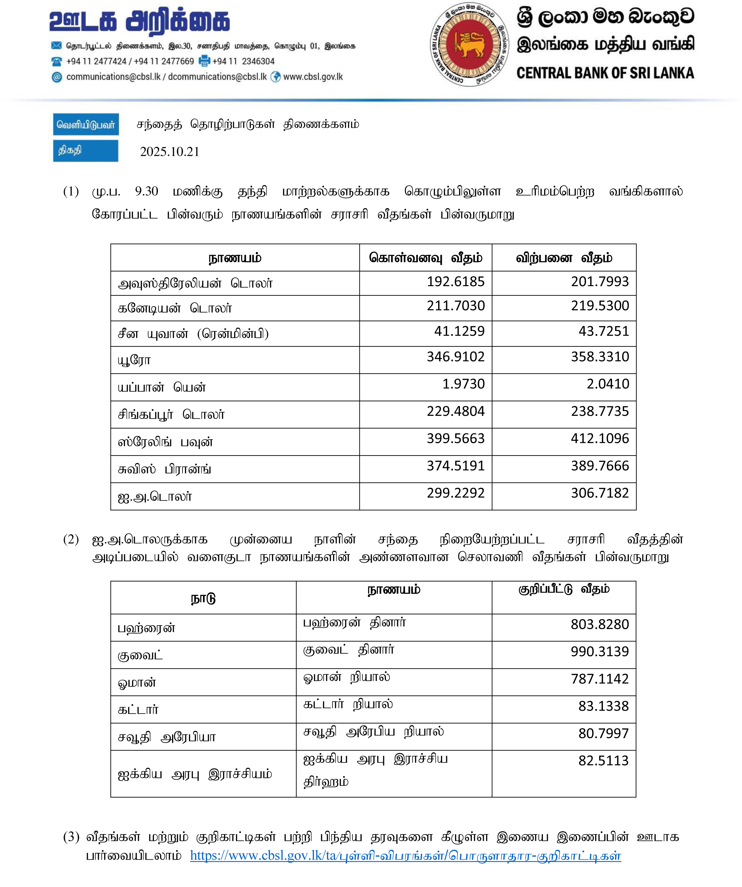 அதன்படி, ஏனைய வெளிநாட்டு நாணய மாற்று விகிதங்கள் தொடர்பாக இன்று (21.10.2025) மத்திய வங்கியினால் வெளியிடப்பட்டுள்ள தகவல்கள் கீழே தரப்பட்டுள்ளது.