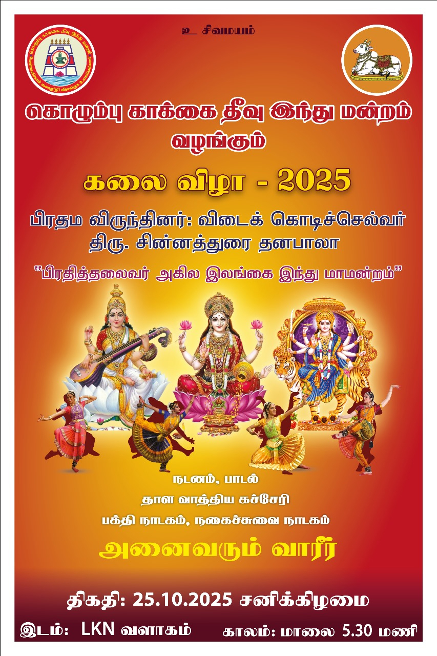 கொழும்பு காக்கை தீவு இந்து மன்றத்தின் ஏற்பாட்டில் “கலை விழா - 2025” நிகழ்வு நாளை சனிக்கிழமை 25ஆம் திகதி கொழும்பு LKN வளாகத்தில் மாலை 5.30 மணிக்கு நடைபெறவுள்ளது.