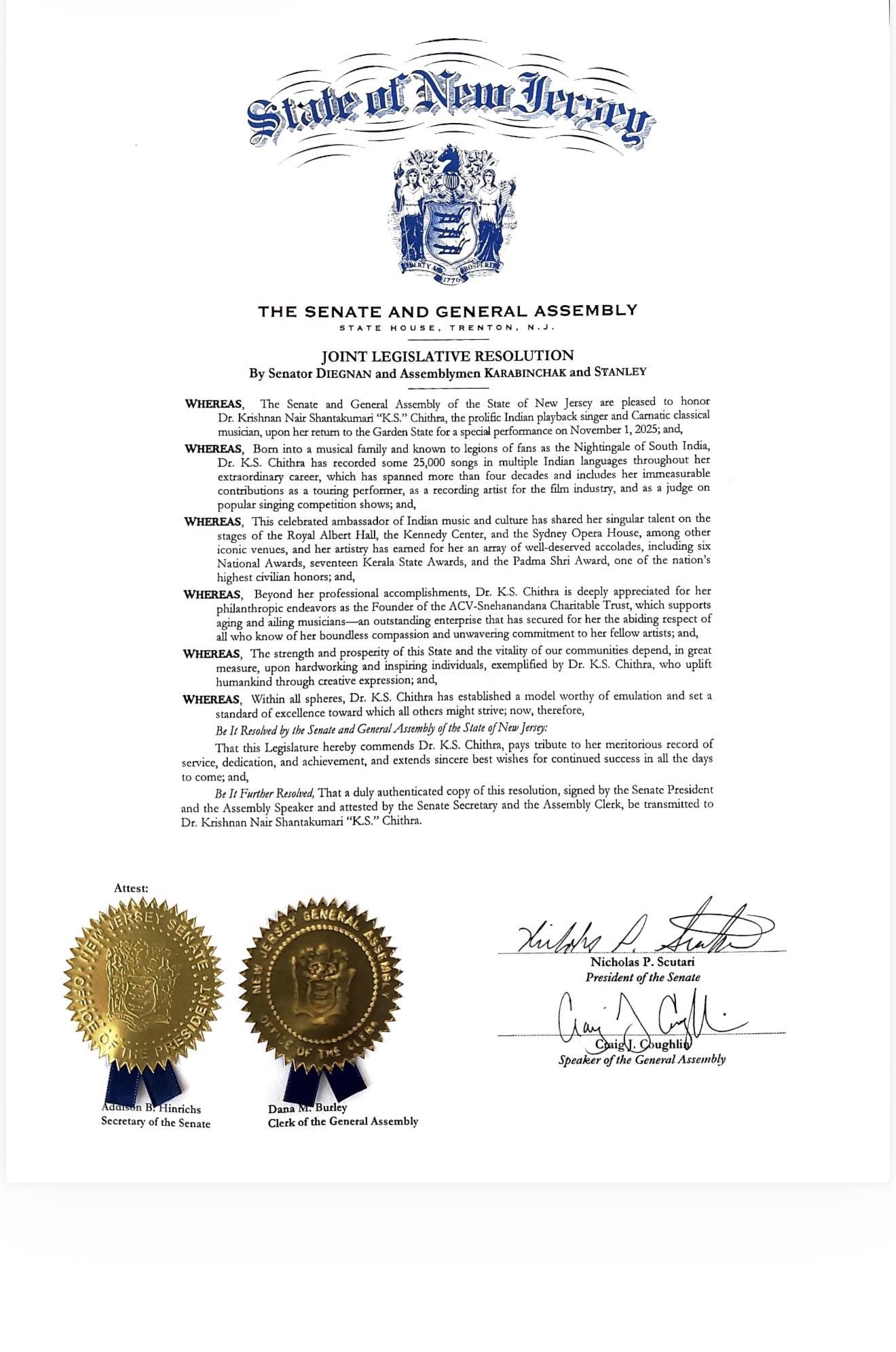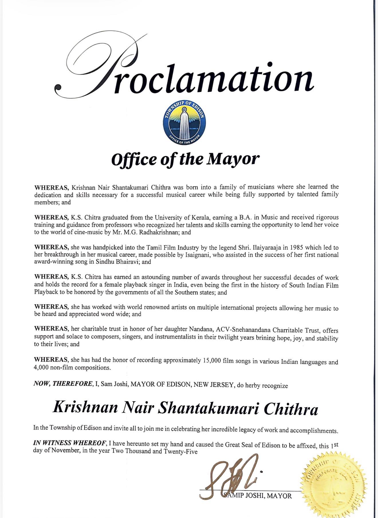 தென்னிந்திய பிரபல பாடகியான சின்னக்குயில் கே.எஸ்.சித்ராவுக்கு அமெரிக்காவின் நியூ ஜெர்சி மாநிலத்தின் எடிசன் நகர மேயர் கௌரவித்து பாராட்டுச் சான்றிதழ் வழங்கியுள்ளார்.