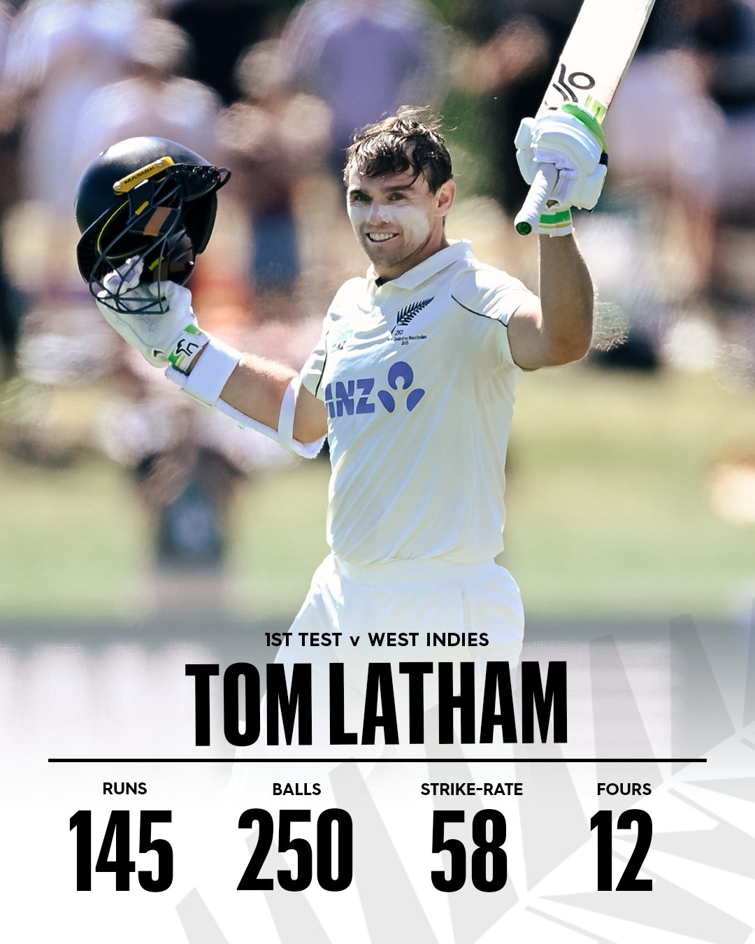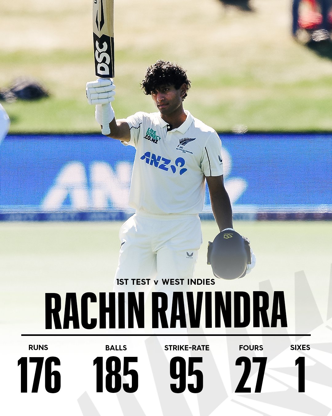 அதன் பின்னர் டொம் லெதம், ரச்சின் ரவிந்த்ரா ஆகிய இருவரும் மேற்கிந்தியத் தீவுகளின் பந்துவீச்சாளர்களை சிதறடித்து சதங்கள் குவித்து நியூஸிலாந்தை பலமான நிலையில் இட்டனர்.