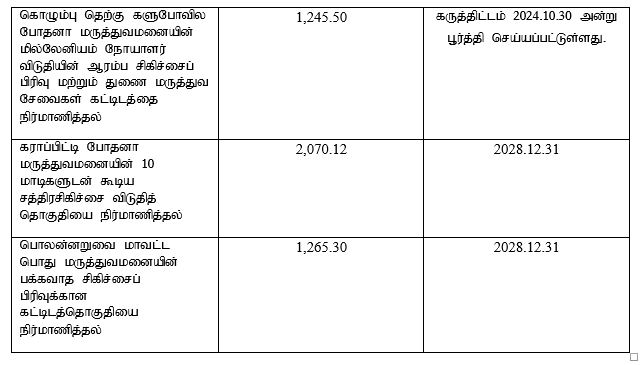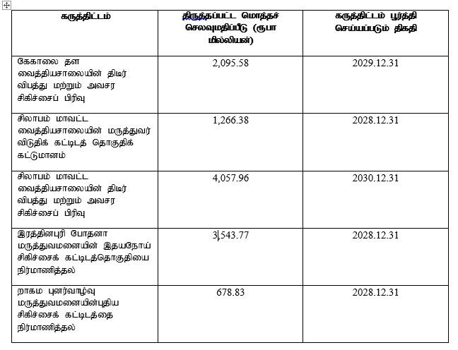 அதற்கமைய, தற்போது வேலைகள் பூர்த்தி செய்யப்படாமலுள்ள கீழ்வரும் 08 சுகாதார உட்கட்டமைப்பு வசதிகள் கருத்திட்டங்களுக்கான மொத்தச் செலவு மதிப்பீடு மற்றும் கால அட்டவணையைத் திருத்தம் செய்து, அவற்றின் நிர்மாணப் பணிகளை மீண்டும் ஆரம்பிப்பதற்காக சுகாதாரம் மற்றும் வெகுசன ஊடக அமைச்சர் அவர்கள் சமர்ப்பித்துள்ள யோசனைக்கு அமைச்சரவை அங்கீகாரம் வழங்கியுள்ளது :