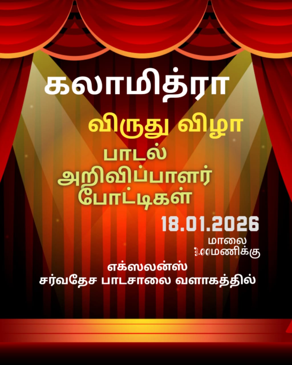 புதிய அலை கலை வட்டம் வருடாந்தம் நடத்தும் கலாமித்ரா விருது விழாவை முன்னிட்டு நடத்தப்படும் கலை, கலாசார போட்டி தொடரின் அம்சமாக வரும் ஞாயிற்றுக்கிழமை (18) மாலை 3.00 மணிக்கு பாடல் மற்றும் அறிவிப்பாளர் போட்டிகள் நடைபெறவுள்ளன.