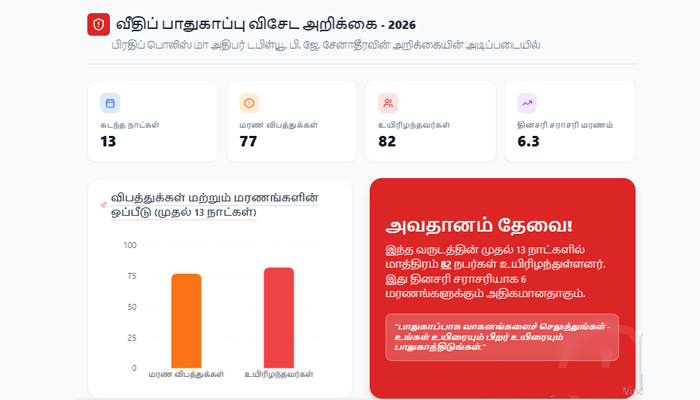 2026 ஆம் ஆண்டின் கடந்த 13 நாட்களில் 77 வீதி விபத்துக்கள் பதிவாகியுள்ளதாக பொலிஸ் போக்குவரத்து கட்டுப்பாடு மற்றும் வீதி பாதுகாப்பு பிரிவின் பிரதி பொலிஸ் மா அதிபர் டபிள்யு. ஜி. ஜே. சேனாதீர தெரிவித்துள்ளார்.