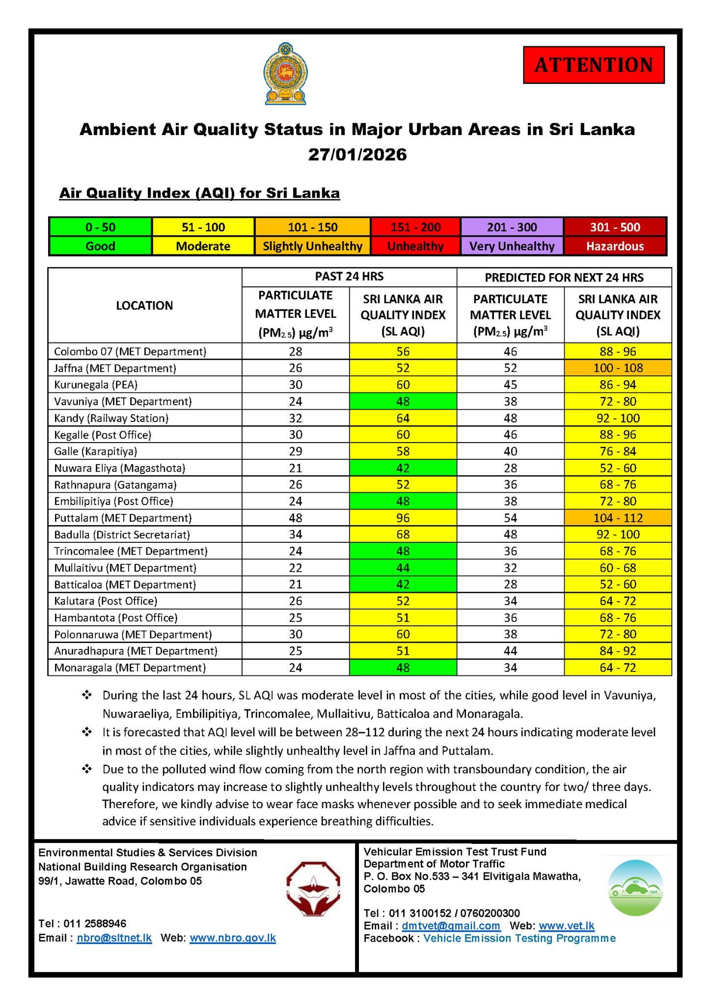 எனினும், அடுத்த 24 மணித்தியாலங்களில் யாழ்ப்பாணம், புத்தளம் உள்ளிட்ட பல நகரங்களில் காற்றுத் தரம் மிதமானது முதல் சற்றே ஆரோக்கியமற்ற நிலை வரை மாறக்கூடும் என NBRO எச்சரித்துள்ளது.