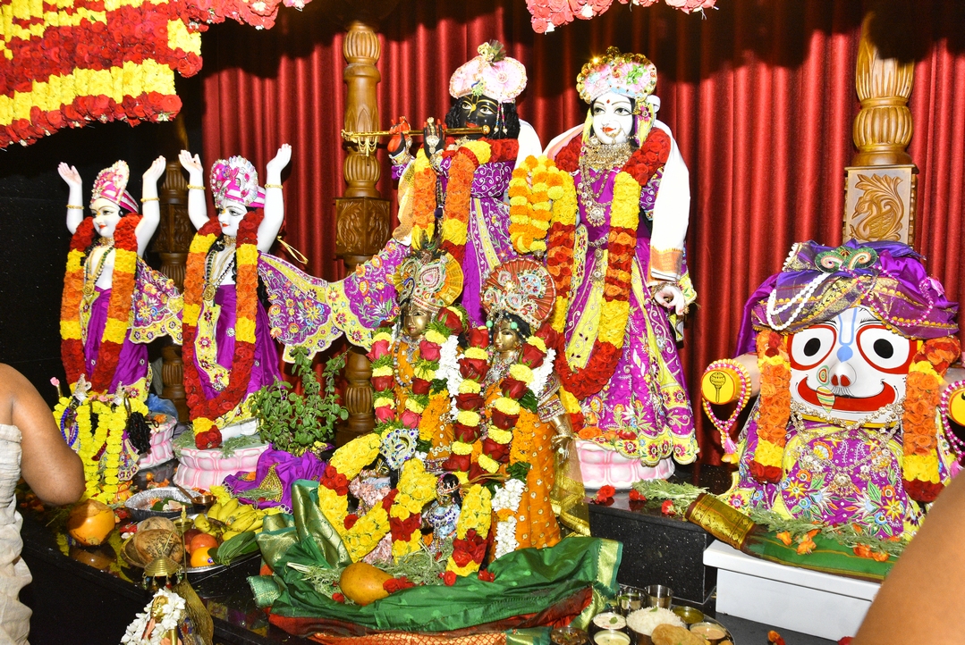 தலைமை குருக்கள் டாக்டர். ஆனந்தமாயா தாஸா ஆச்சாருயார், ஸ்ரீ ரங்கராஜன் ஐயங்கார் முன்னிலையில் காலை 10.55 மணி முதல் 11.55 மணி வரையிலான சுப முகூர்த்த வேளையில் மூலஸ்தானத்தில் எழுந்தருளியுள்ள ஸ்ரீ ஸ்ரீ ராதாகிருஷ்ணன, ஸ்ரீ கௌரவ நிதாய், ஜெகநாத பலராம சுபத்ரா விக்கிரகங்களுக்கு திரவியங்களால் தயாரிக்கப்பட்ட பதார்த்தம் மூலம் அபிஷேகம் நடைபெற்றன நிகழ்வில் கஜமுகன்(யானை) ஆலயத்தின் உள்ளே சென்று ஆசீர்வதித்து வெளியேறுவதைதயும், 137 அடி உயர இராஜ கோபுரத்திற்கு கும்பாபிஷேகம் நடைபெற்றது.