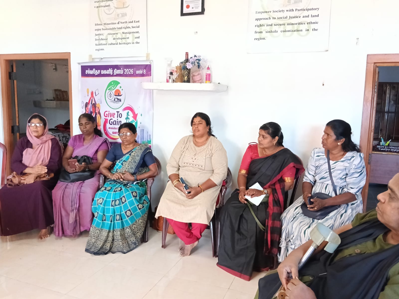 சூழல் மற்றும் சமூகத்தின் அபிவிருத்தியை வலுவூட்டும் நிறுவனத்தின் ஏற்பாட்டில் முல்லைத்தீவில் சமூக மட்டத்தில் சேவைகளை வழங்கிவரும் அமைப்புக்களின் பெண் பிரதிநிதிகளை அழைத்து மகளீர் தின கலந்துரையாடல் ஒன்றினை வியாழக்கிழமை (12) ஏற்பாடு செய்து ஊடகங்களுக்கு கருத்து தெரிவித்துள்ளார்கள்.
