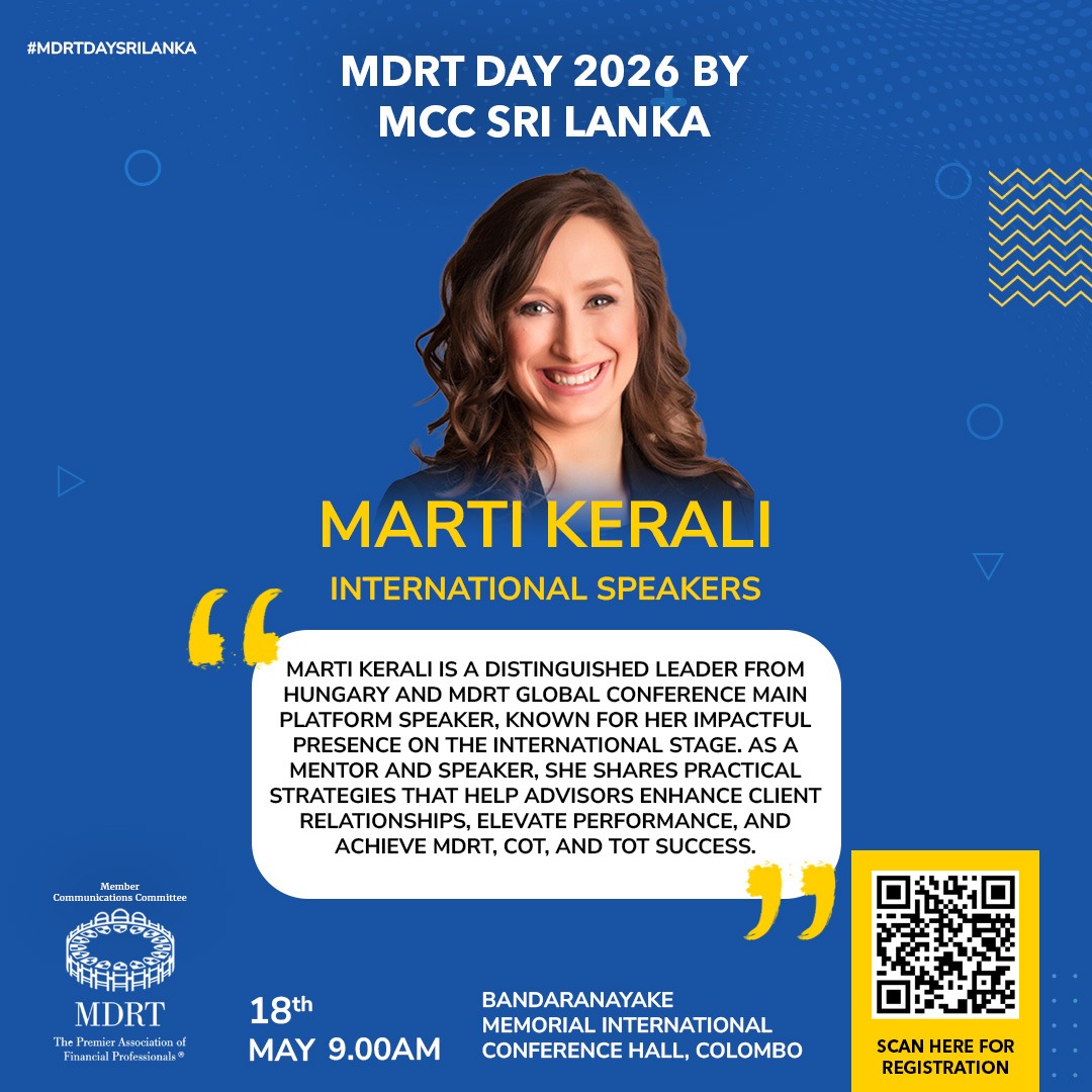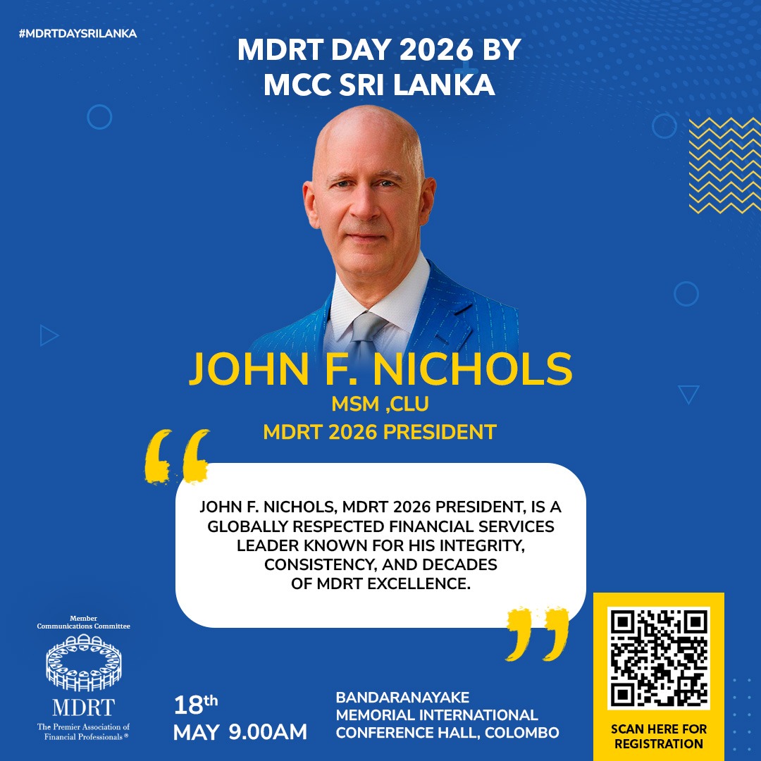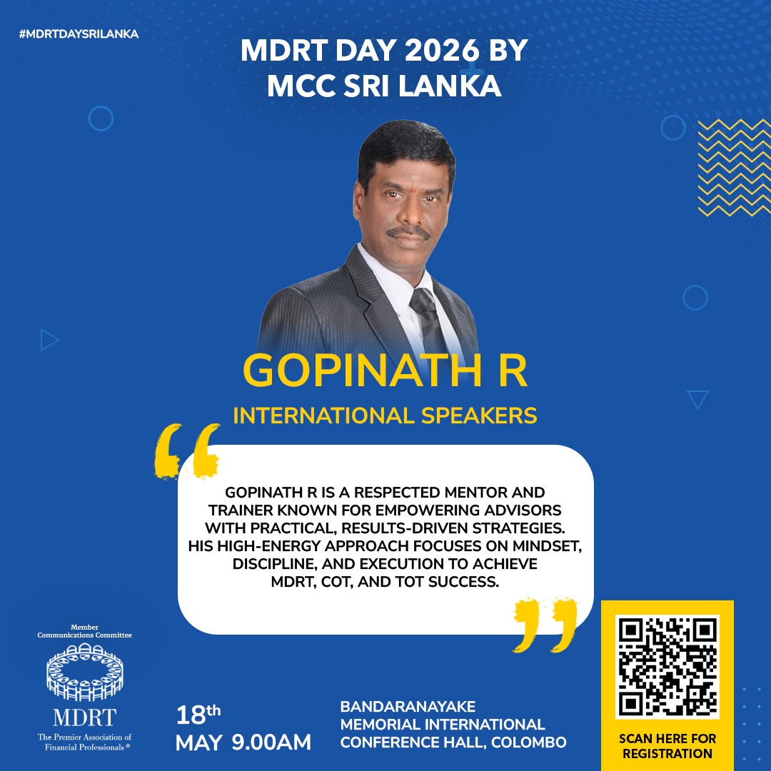 காப்புறுதி மற்றும் நிதிச் சேவைத்துறையில் உலகத்தரம் வாய்ந்த நிபுணர்களின் கூட்டமைப்பின் (Million Dollar Round Table (MDRT)) 2026 ஆம் ஆண்டுக்கான MDRT MCC Day நிகழ்வு, மே மாதம் 18 ஆம் திகதி கொழும்பிலுள்ள பண்டாரநாயக்க ஞாபகார்த்த சர்வதேச மாநாட்டு மண்டபத்தில் நடைபெறவுள்ளது.