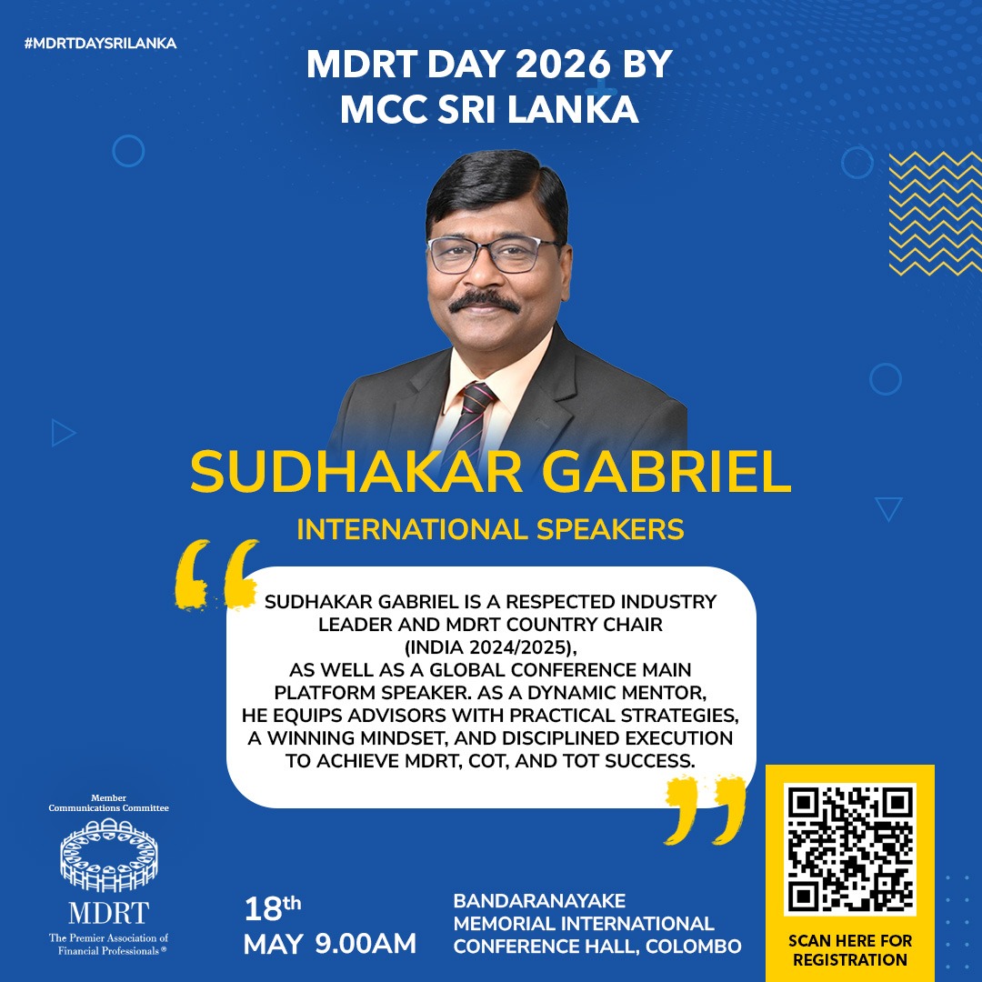 அதன்படி, 2026 ஆம் ஆண்டுக்கான MDRT தலைவர் ஜோன் எப். நிக்கோல்ஸ் உள்ளிட்ட சர்வதேச பேச்சாளர்களாக சுதாகர் கேப்ரியல், கோபிநாத், காஸிம் ரஸா, மார்ட்டி கெரலி, சன்ட்ரோ போர்டி மற்றும் கலாநிதி சஞ்ஜய் டொலனி ஆகியோர் கலந்து கொள்ள உள்ளனர்.