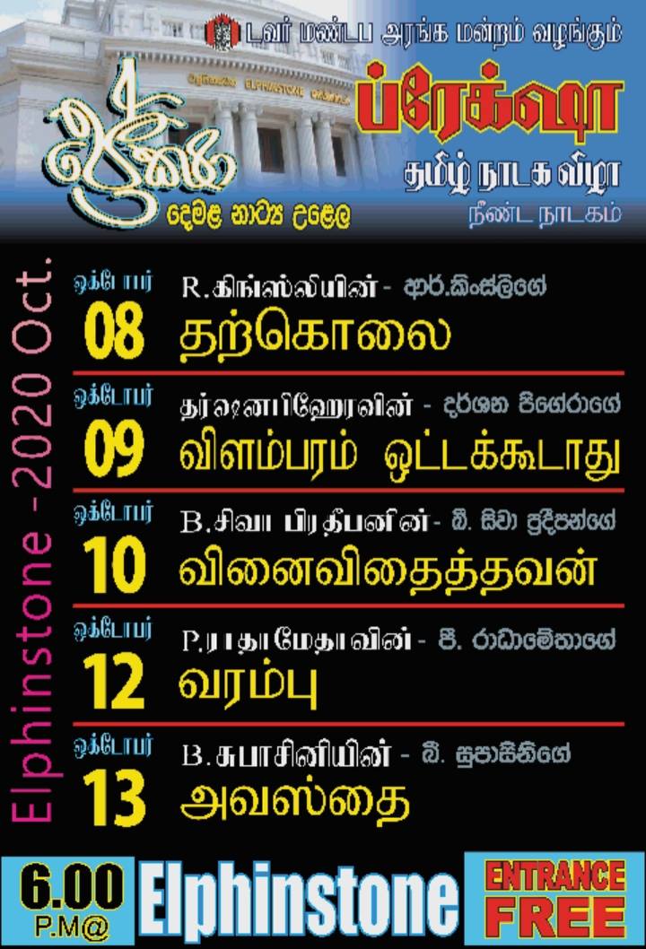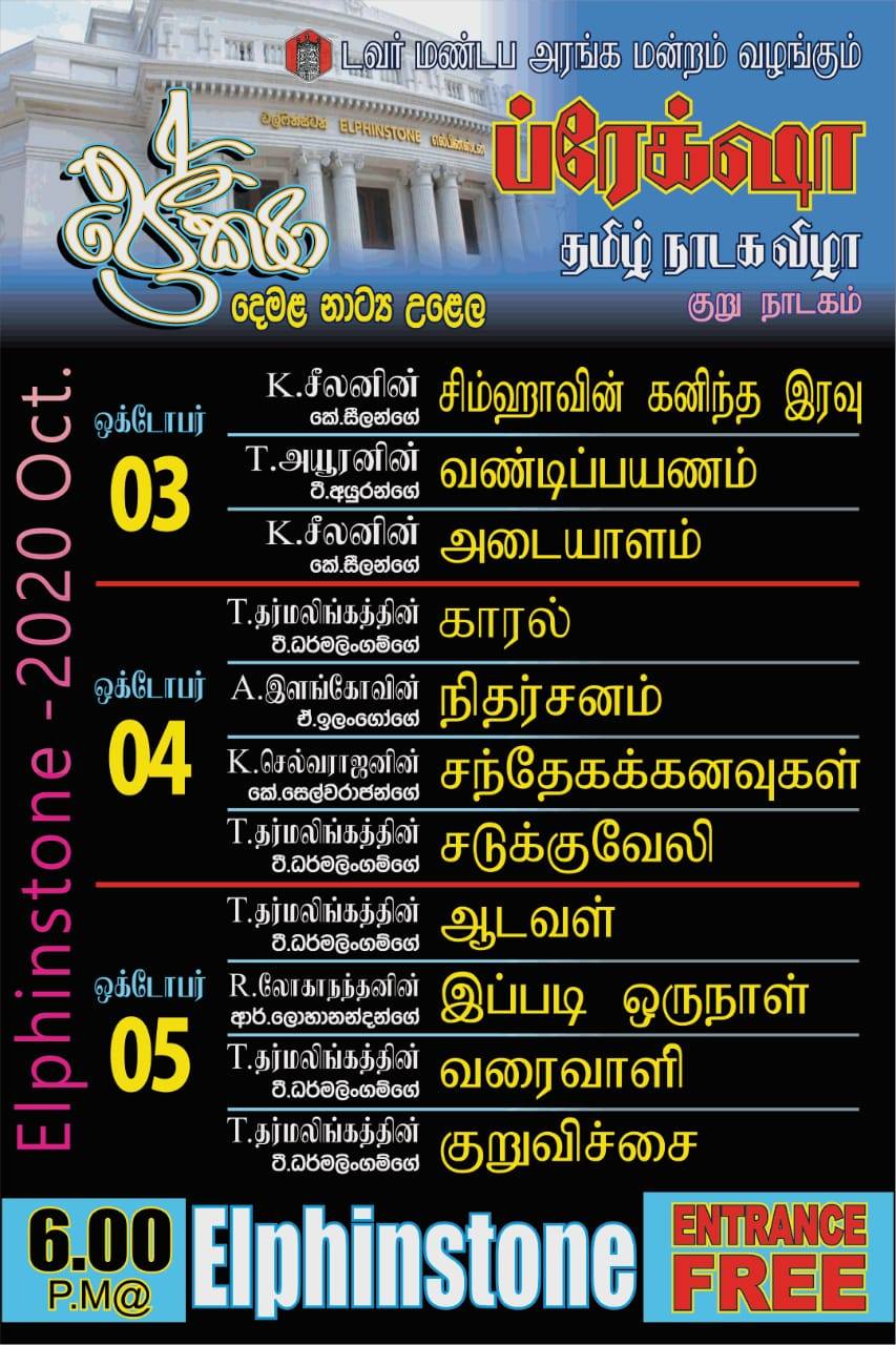 தமிழ் நாடக விழா நாளை 3ஆம் திகதி முதல் மருதானை எல்பின்ஸ்டன் அரங்கில் ஆரம்பமாகவுள்ளது.