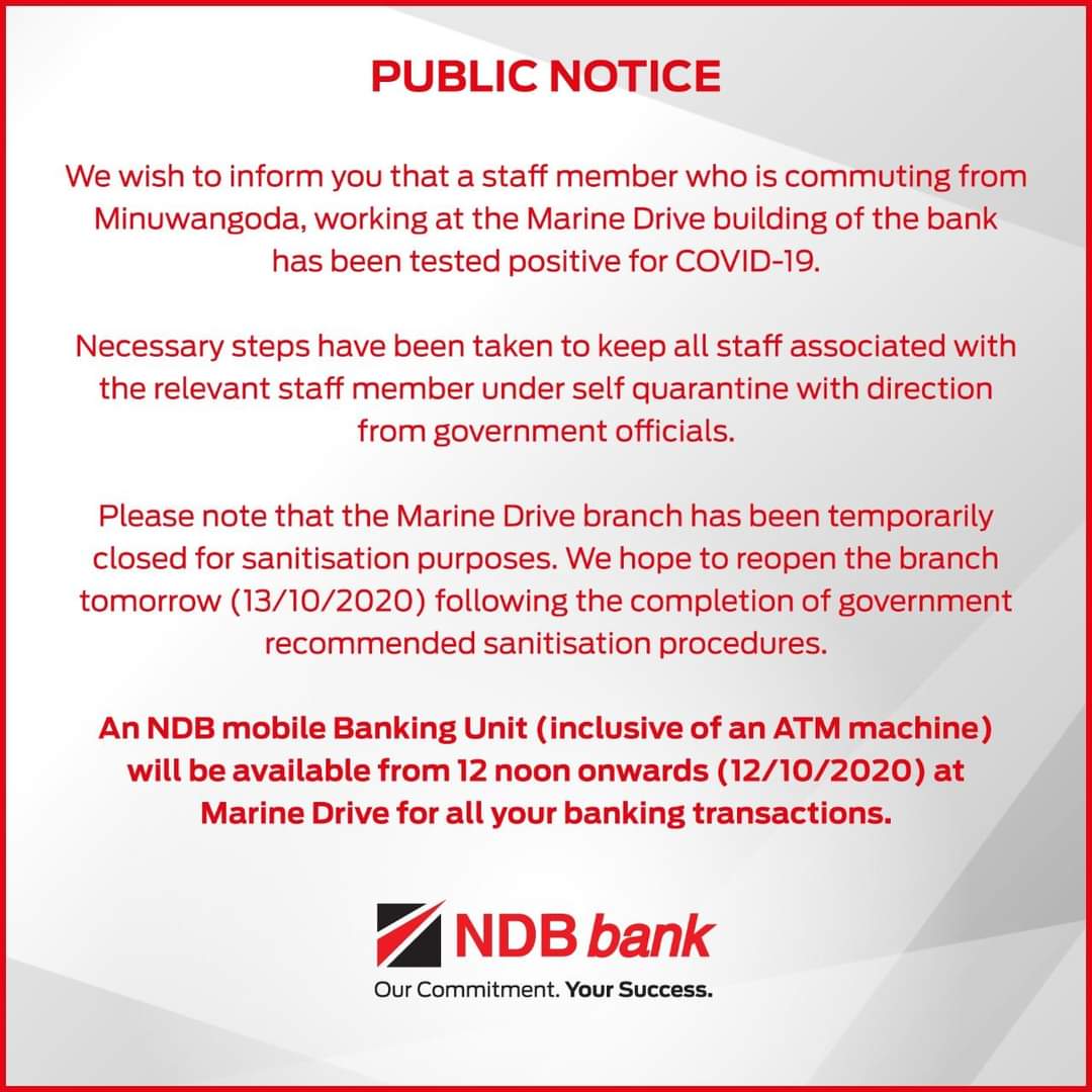 என்.டி.பி (NDB)வங்கியின் கொழும்பு 04 இல் அமைந்துள்ள (மரைன் டிரைவ்) கிளை தற்காலிகமாக மூடப்பட்டுள்ளதாக குறித்த வங்கி அறிவித்துள்ளது.